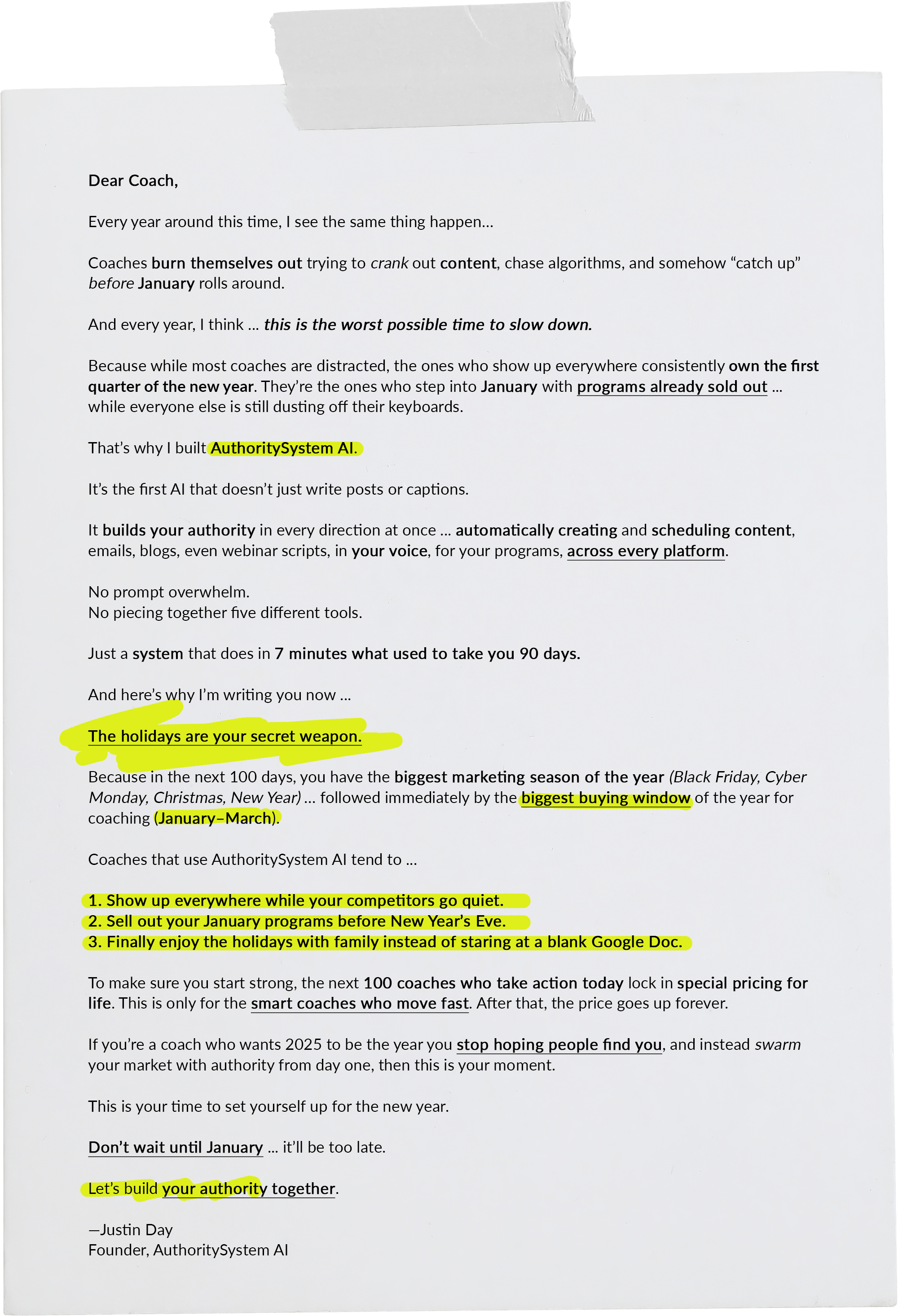 Launch a holiday or Q1 content campaign today (yes, same-day). AuthoritySystem AI’s plug-and-play playbooks and frameworks let you execute in minutes, not weeks.